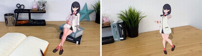 デジタルフィギュアは、場所を問わず好きな場所にキャラクターを配置でき、ポーズ・大きさ・表情など細かい調整まで可能です。自身の好みに調整して、現実世界を背景にし、まるでキャラクターがそこにいるかのような演出で鑑賞、撮影することができます。デジタルフィギュアは付属品だけでなく、自身が所有する小物や家具(リアルアイテム)と合わせてもお楽しみ頂けます。